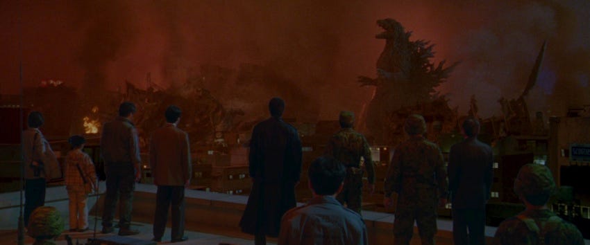 Abe's Katagiri has hints of obsession that are never fully explored, but interesting to watch. He's written like a samurai given a “simple” mission to stop the monster. This throwback to the samurai code comes full circle when Katagiri realizes he can not accomplish his mission. Coming to terms with his failure, Katagiri lights up a cigarette and watches Godzilla approach him. The other characters look on as Shinoda tries to save him, but Katagiri notably doesn't want to be saved. His apparent suicide plays out like an execution by Godzilla—A subtle nod to seppuku (or “harakiri” to most westerners) following the dishonor of failure.