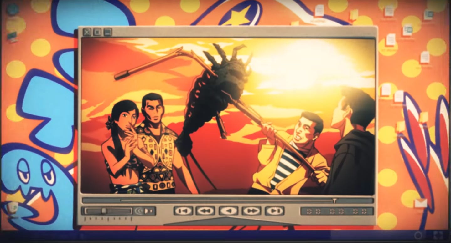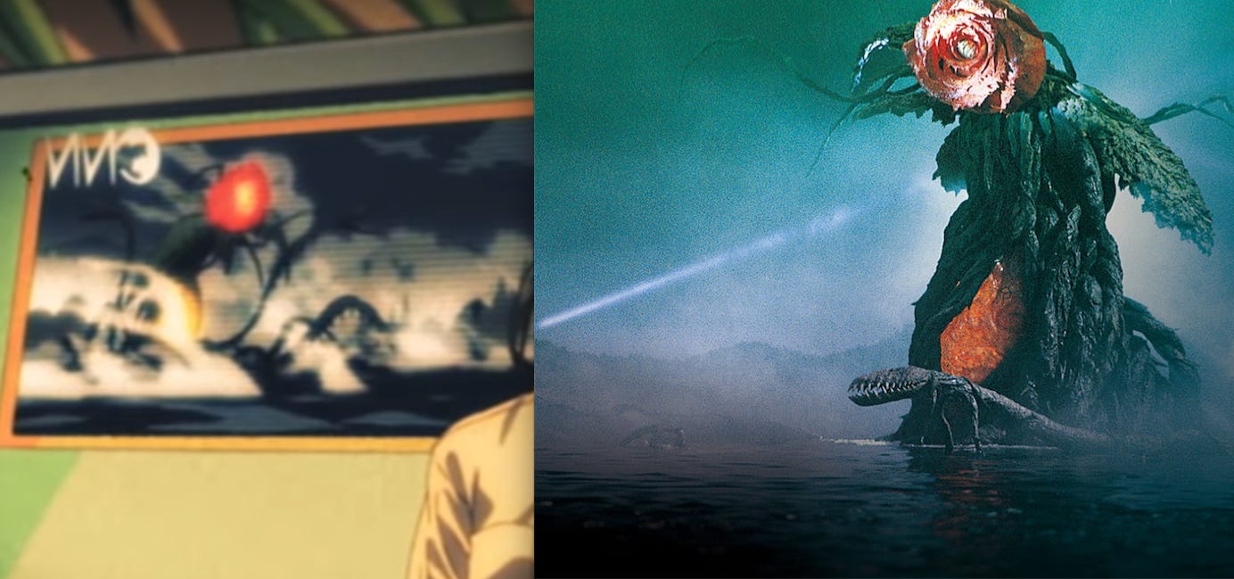 BLUE CIRCLE: The references to Godzilla vs. Gigan aren't over just yet. Gengo's girlfriend, Tomoko Tomoe, is easy to spot in the shirt Gengo used as inspiration for his "Mamagon" monster design.