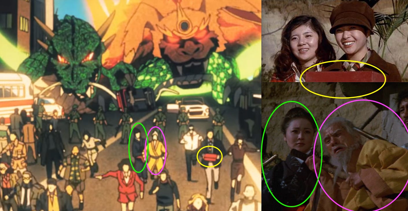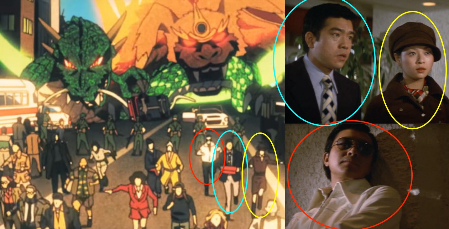 RED CIRCLE: The cast of characters from Godzilla vs. Gigan (1972) seems to take up the majority of the frame. Main character and manga artist Gengo Odaka is circled in red wearing his long coat and satchel.