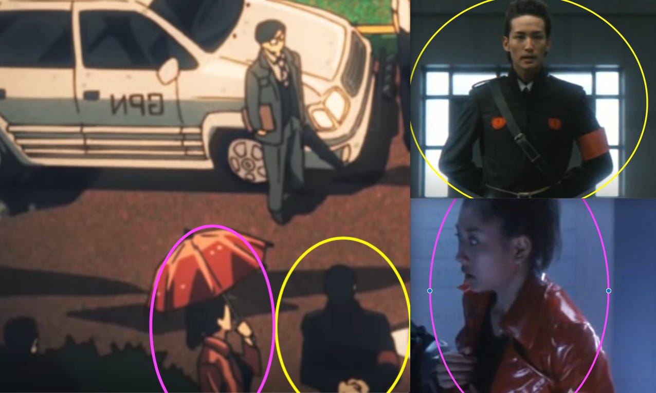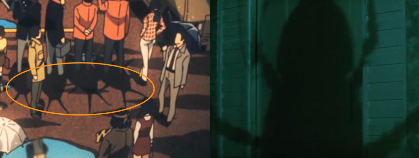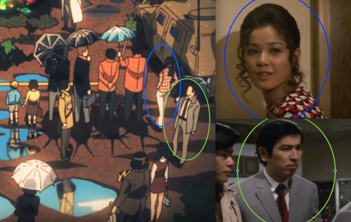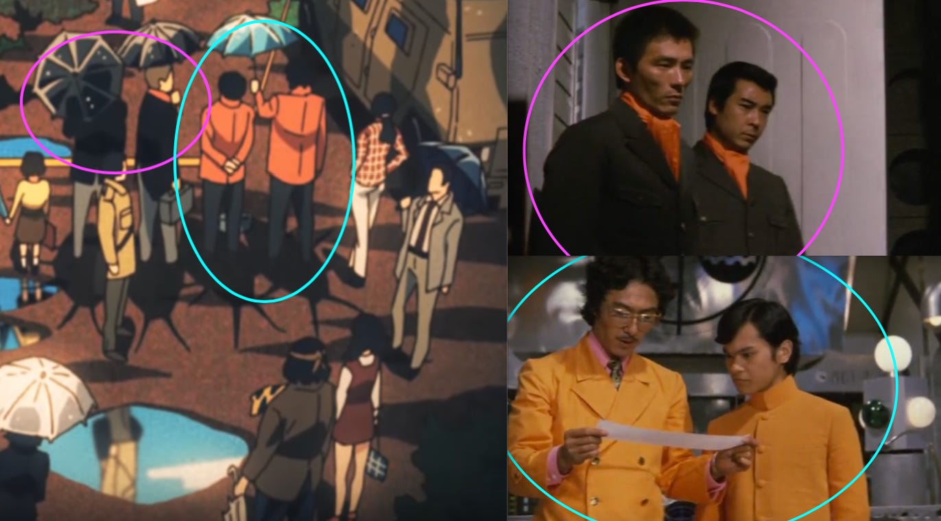TEAL CIRCLE: Even the main villains have invested interest in this frame. Fumio Suda (the shorter one in orange) and Kabota (holding the umbrella) observe the scene next to their henchmen.