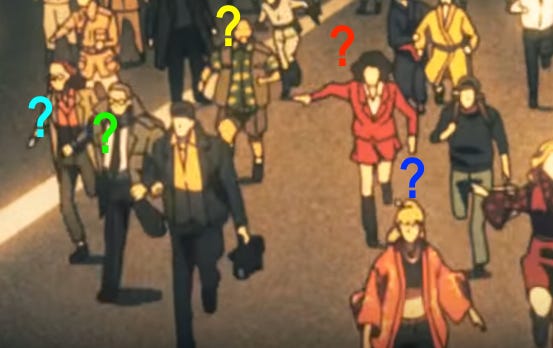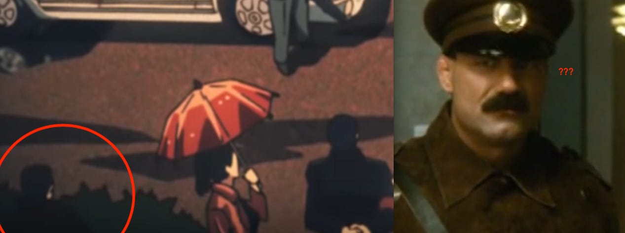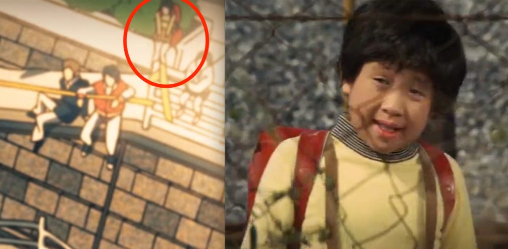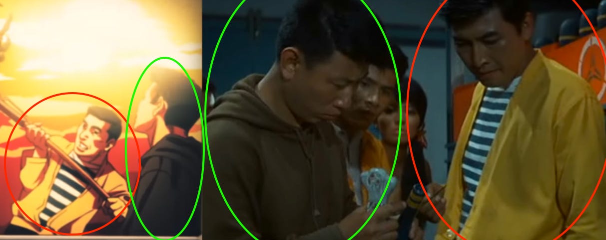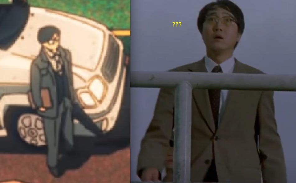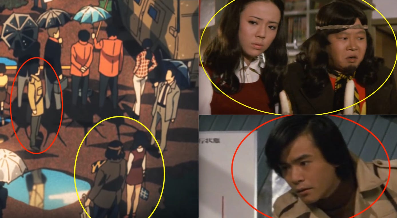 TEAL CIRCLE: Even the main villains have invested interest in this frame. Fumio Suda (the shorter one in orange) and Kabota (holding the umbrella) observe the scene next to their henchmen.
