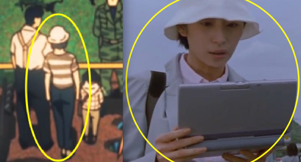 YELLOW CIRCLE: Yuki Ichinose, the Shinoda's news reporter friend, hangs out with them. Her hat is the biggest giveaway.