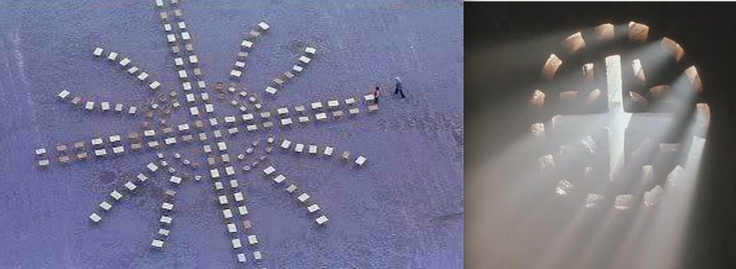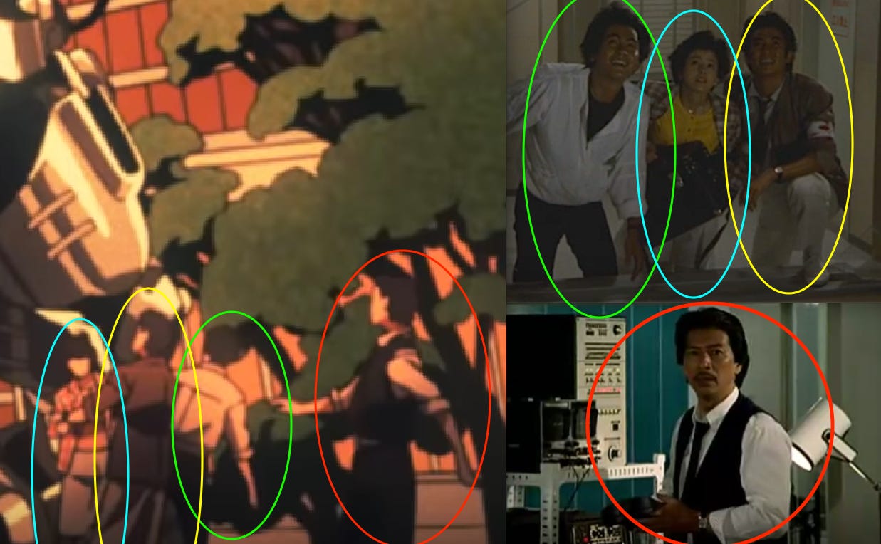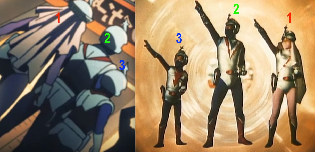 ORANGE CIRCLE: In case there was any doubt these were the aliens from Nebula M Spacehunter, the shadows of Suda, Kabota and their henchmen hint at their true forms. This brings to mind a similar moment from Godzilla vs. Gigan.