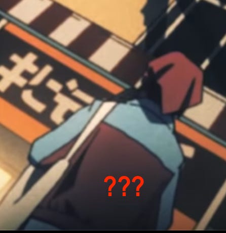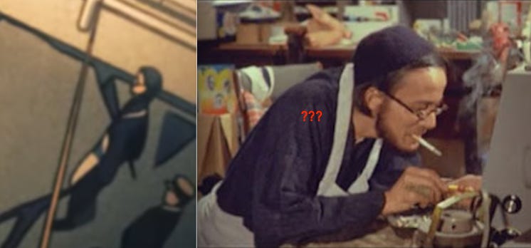 Finally we get to my last frame and Mei's destination! A shop where she is doing homework includes a full restaurant with some familiar faces. Although I have no doubt there may be other known characters behind her, there was only one set that jumped out at me.