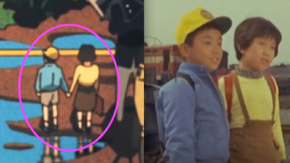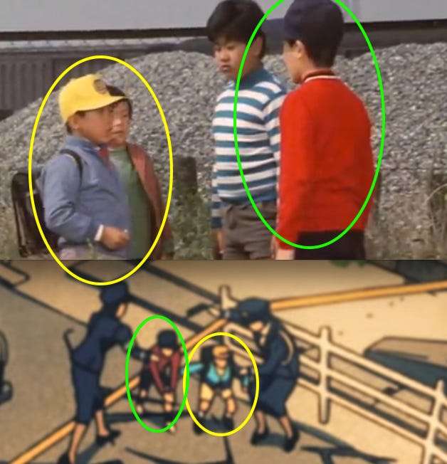 PURPLE CIRCLE: Standing next to Mei's right is Ichiro Miki holding hands with his friend Sachiko. (Are they an item?) Ichiro is wearing his yellow hat and blue jacket. Sachiko is in her yellow shirt--Both straight out of All Monsters Attack (1969).