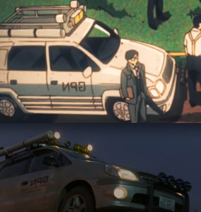 To the left of the frame is Shinoda's "Godzilla Prediction Network" (GPN) van from Godzilla 2000 (1999).