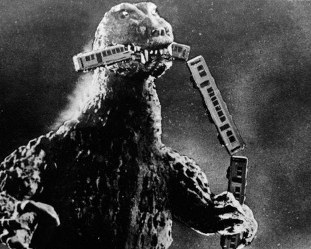 It's also worth pointing out the homage to Godzilla's train attack seen in publicity shots of the original 1954 film. Though it happens in the movie, this photo tends to inspire other merchandise. It wouldn't shock me if it was also the inspiration for the moment above.