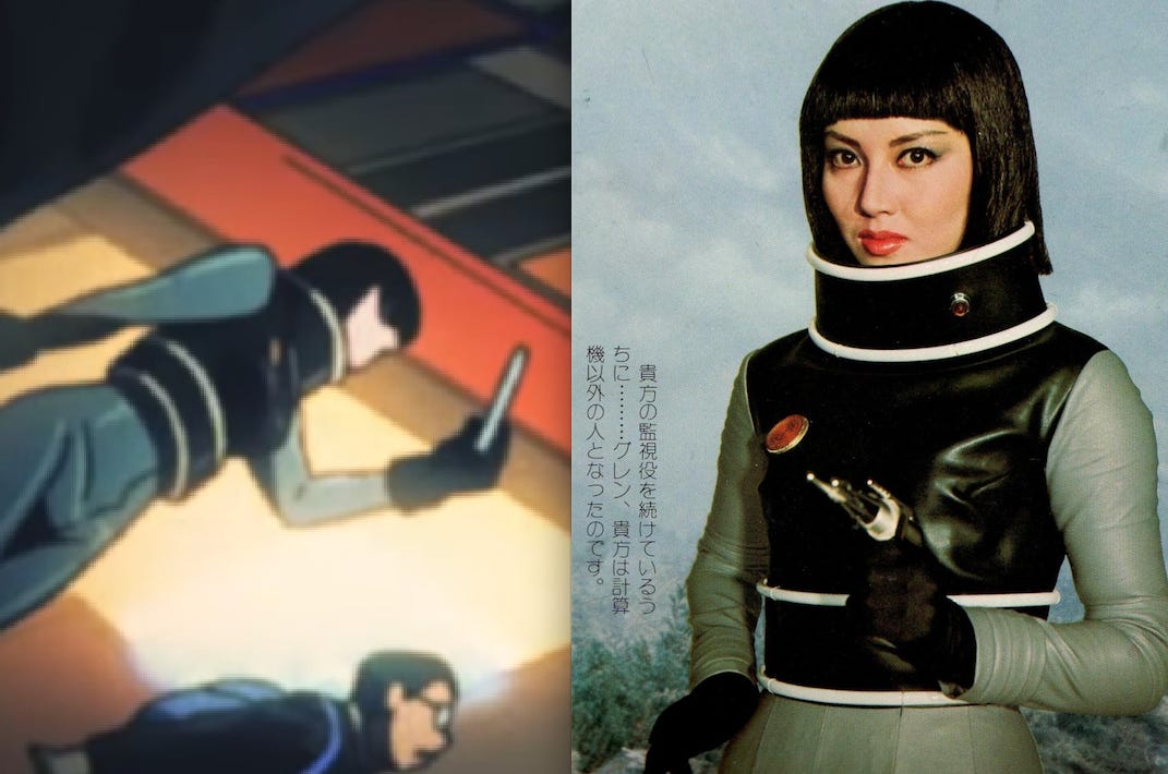 GREEN CIRCLE: Behind Tomoko appears to be Machiko's brother, Takeshi Shima, who was held captive by the Nebula M aliens. His suit appears to match the one he wears on screen.