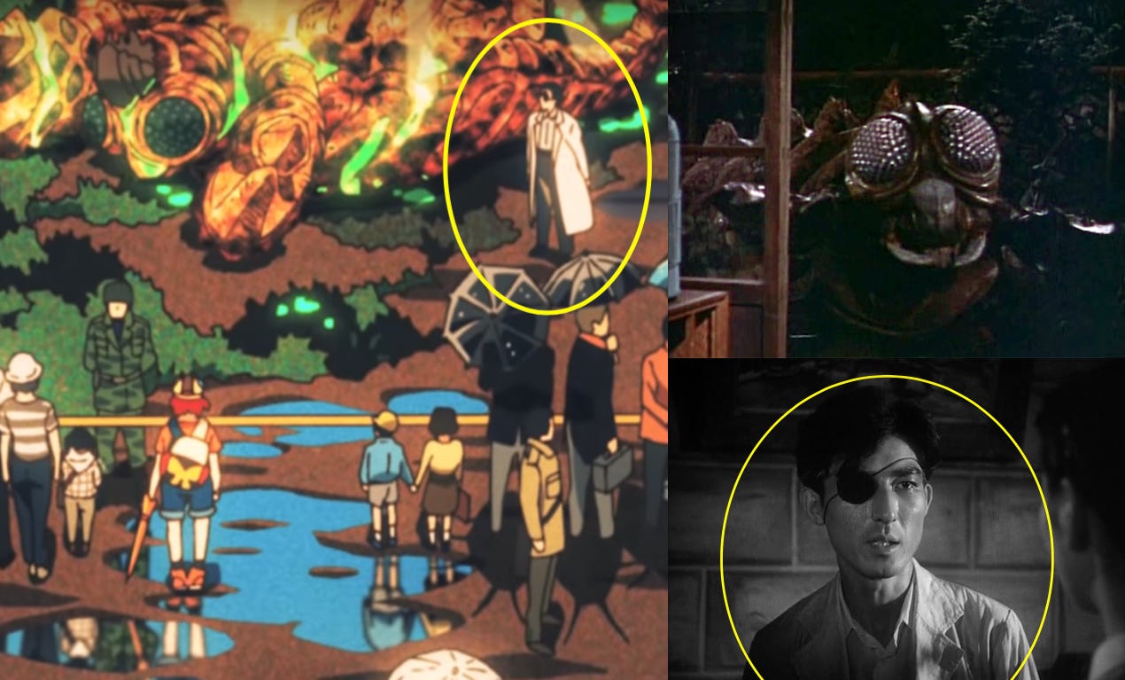 YELLOW CIRCLE: Of course one of the most well known characters in the franchise had to make a cameo. Dr. Daisuke Serizawa, from the original Godzilla (1954), observes the Meganulon carcass in his staple lab coat--Eye patch and all.