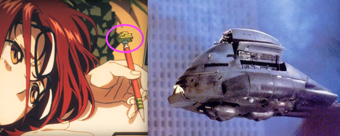 PURPLE CIRCLE: It's a little difficult to tell, but it looks like the hover ship, Super X, from The Return of Godzilla (1984) is stuck to the top of her pencil.