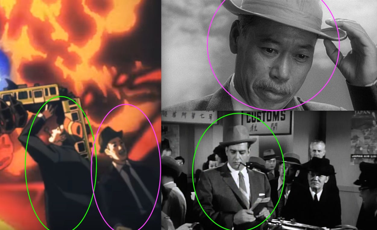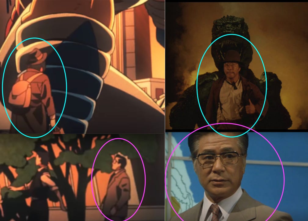 PURPLE CIRCLE: Dr. Yamane from the original Godzilla makes a not so shocking guest appearance with his specific mustache and hat. (Although I think it would've been a nice touch to keep his coat closed with the tie hanging out.)
