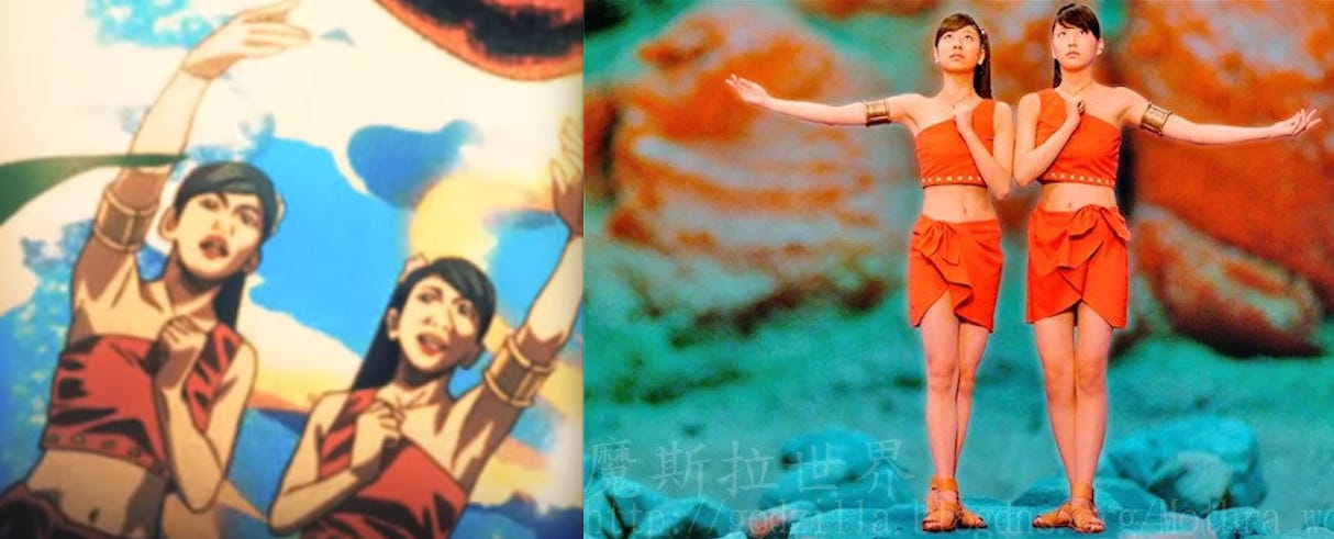 The Shobijin depicted here, however, are from Godzilla: Tokyo SOS. The costume designs and hair line up perfectly with their look in the Kiryu Saga's finale. Although the same costumes and actresses were used for Godzilla: Final Wars, their hair was much shorter in that film.